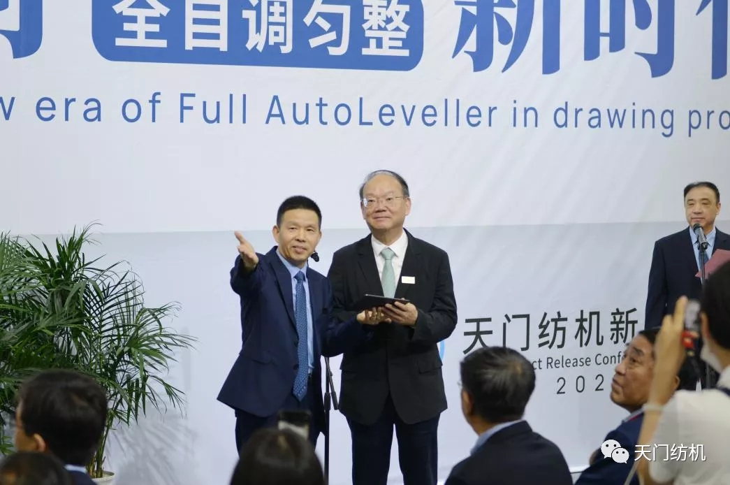 2021年6月12日,在上海國際紡機(jī)展上天門紡機(jī)舉行“開創(chuàng)并條工序全自調(diào)勻整新時(shí)代”新品發(fā)布會(huì),中紡聯(lián)黨委書記高勇使用手持終端為新產(chǎn)品開機(jī)