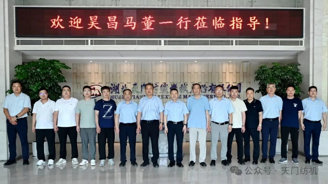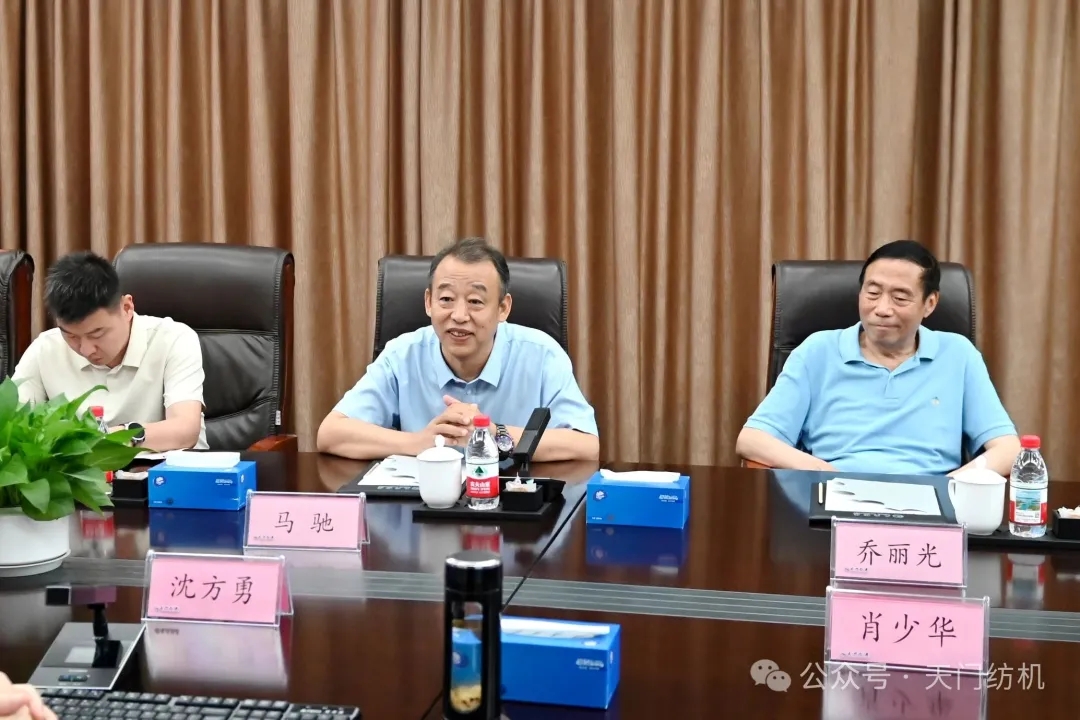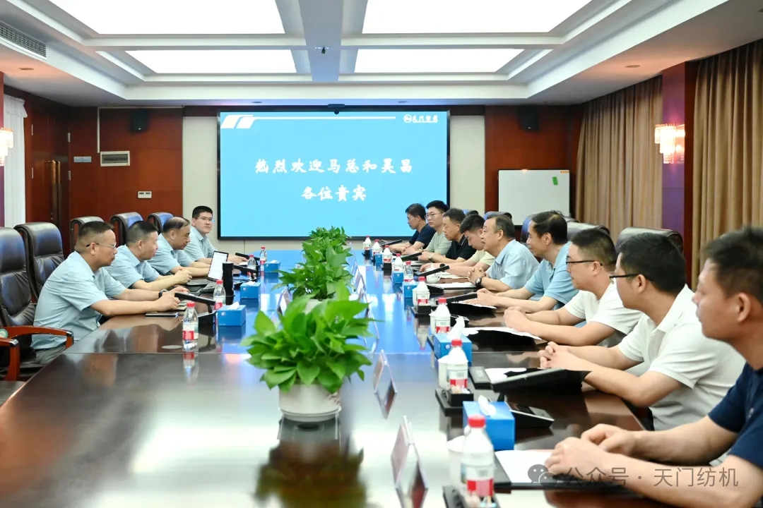 2025年6月30日上午,河南昊昌精梳機械股份有限公司董事長馬馳率高管及中層干部一行9人蒞臨天門紡機,傳經送寶。公司董事長沈方勇率隊熱情接待到訪客人,雙方圍繞企業(yè)發(fā)展進行了深入交流。